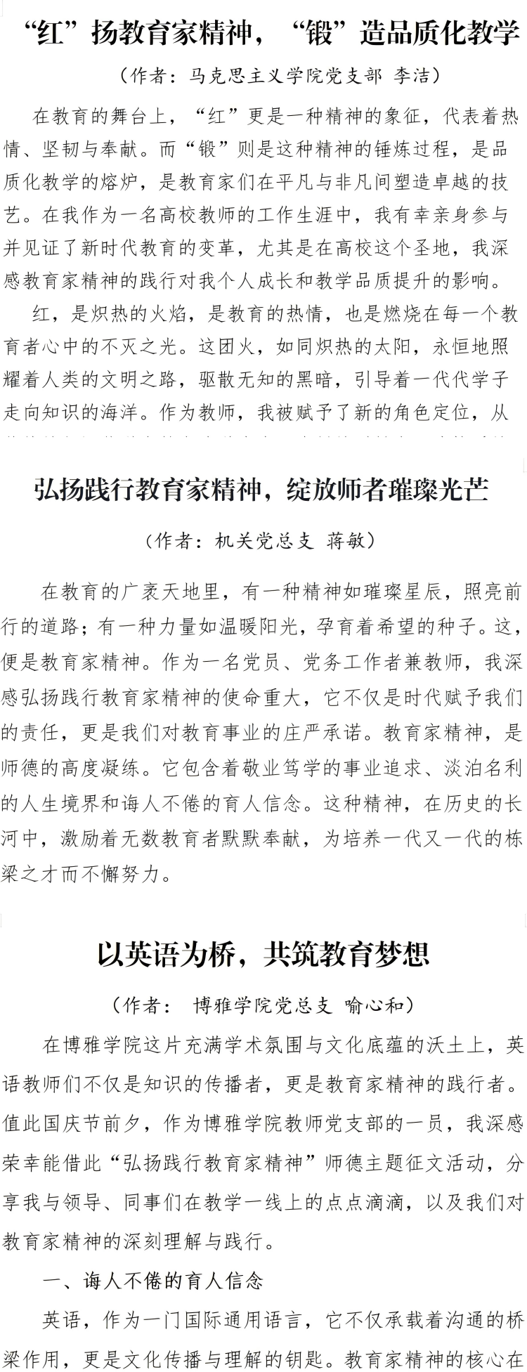 教育家精神,是教育的灵魂和灯塔,引领着无数教育工作者在育人之路上不断前行。本次征文比赛旨在深入挖掘教育家精神的内涵,弘扬师德师风,激发广大师生对教育事业的热爱与奉献。