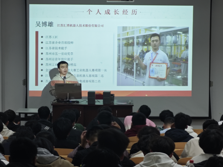2024年11月12日,江苏汇博机器人技术股份有限公司电气工程师吴博雄应邀来到开云工学院,进行了题为“争做新时代‘匠系青年’——机电一体化技术职业规划”的专题讲座。讲座由工学院党总支书记李永泰主持,旨在帮助学生树立职业理想,明确未来发展方向,培养工匠精神。
