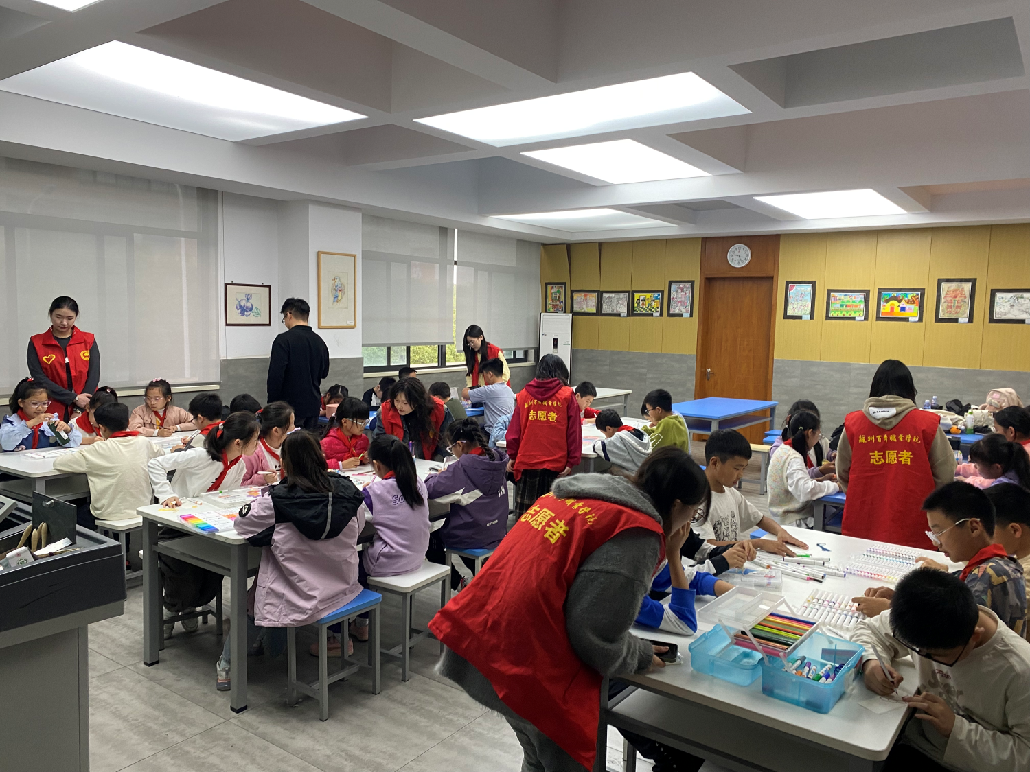 课上小朋友们积极参与,发散自己的思维,志愿者们以身示范,步步引导,小朋友们认真学习,上课积极回答问题,并且通过绘画呈现出自己喜欢的季节和卡通人物。孩子们在“小老师”们的引导下,绘制出了一张张精美的作品,他们洋溢的笑脸是对此次活动最大的肯定。