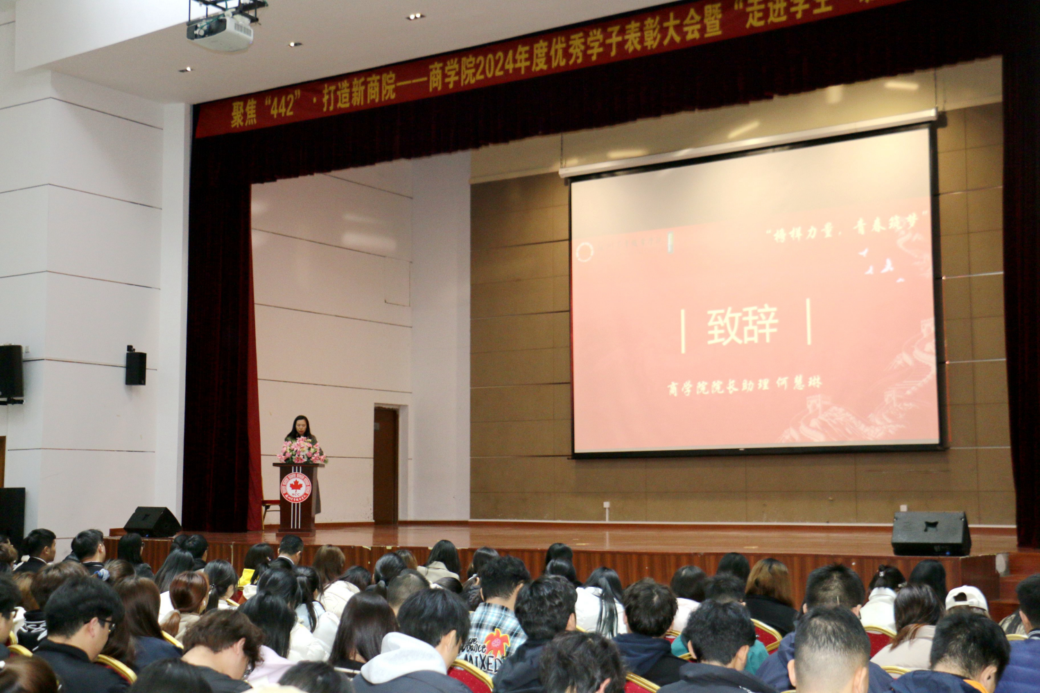 大会在庄严的国歌声中正式拉开帷幕。商学院院长助理何慧琳为大会致辞,她对过去一年中商学院取得的显著成绩表示了充分的肯定,并对全体师生的辛勤付出表示了衷心的感谢。