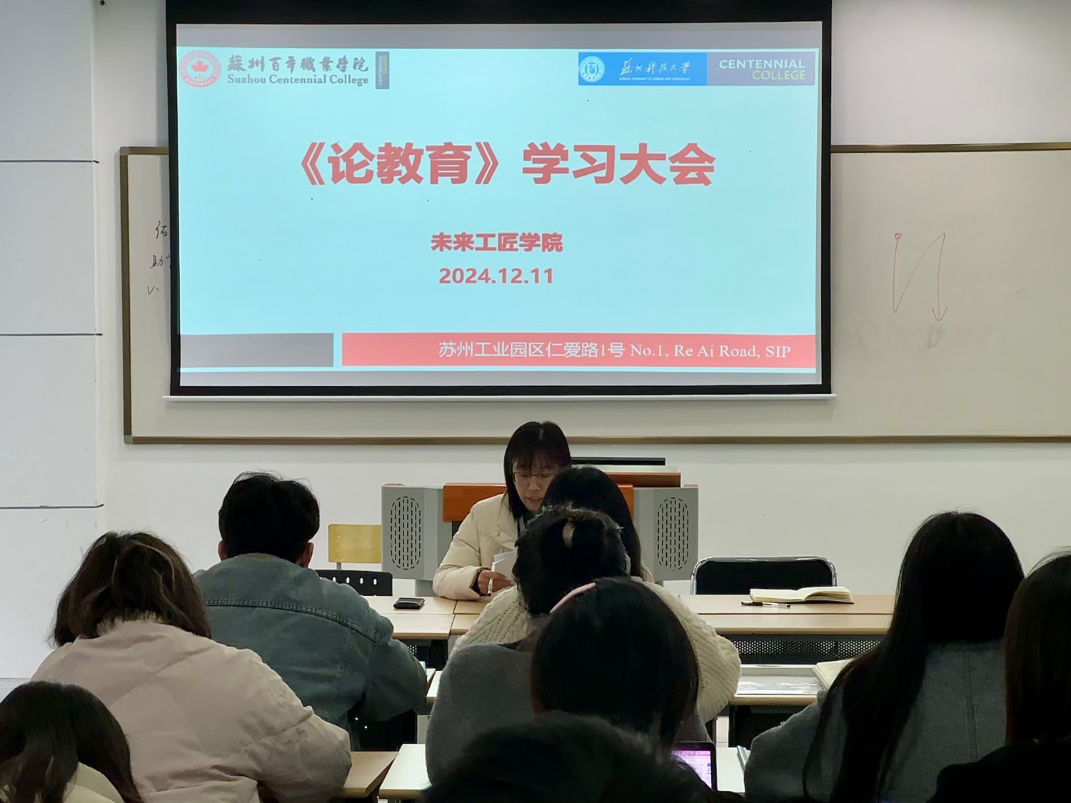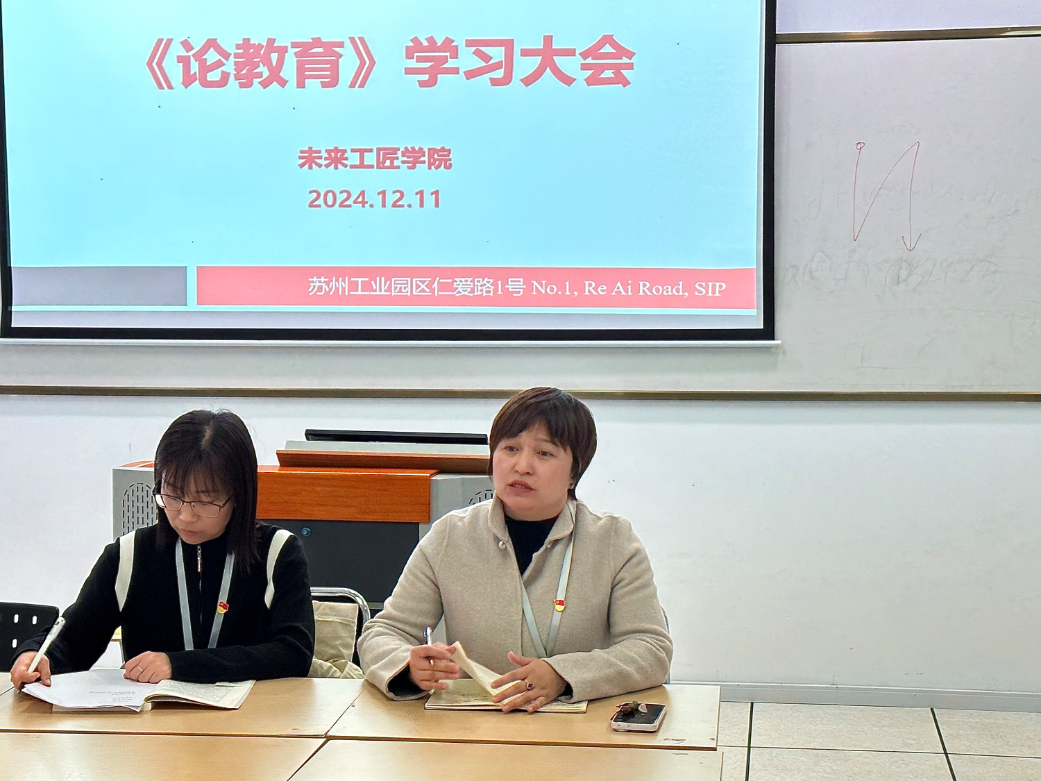 为深入学习贯彻党的教育方针政策,提升全院教师对教育理念的理解与认同,未来工匠学院于12月11日召开了《论教育》学习交流大会。校长助理、未来工匠学院院长侯玉杰出席学习会,学院全体教职工参加,会议由学院党总支书记曹晓娜主持。本次大会旨在通过集体学习与思想碰撞,促进全体教师对教育工作深刻思考与讨论,推动学院教育事业的进一步发展。