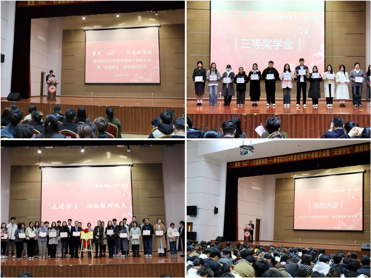 表彰先进,奋勇前行。为进一步树立榜样,表彰先进,坚决执行学校“442”发展战略,落实学校“三走进”要求,组织开展聚焦“442”·打造新商院——商学院2024年度优秀学子表彰大会,激励学生奋勇前行、树立榜样。