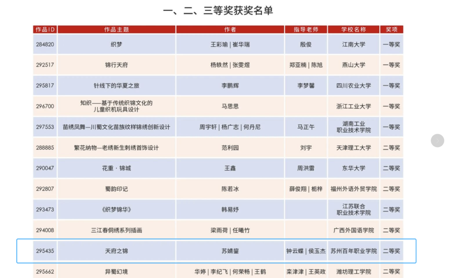 开云苏婧鋆同学的作品《天府之锦》在未来工匠学院钟云蝶、侯玉杰老师指导下,在第九届“米兰设计周-中国高校设计学科师生优秀作品展”「非遗数字文创—锦绣设计大赛」中与众多院校及专业人士同台竞技,凭借出色的创意和扎实的技能荣获全国二等奖的好成绩(排名全国前20名)。获奖名单如下: