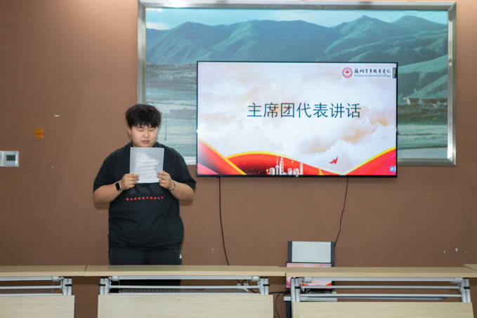 大会伊始,学生会主席团代表程子豪发表讲话,回顾了学生会在过去一年中组织的校园活动、学生服务及团队协作成果,强调未来将继续以服务同学为核心,加强各部门联动,推动学风建设与艺术实践相结合,助力学院文化建设。