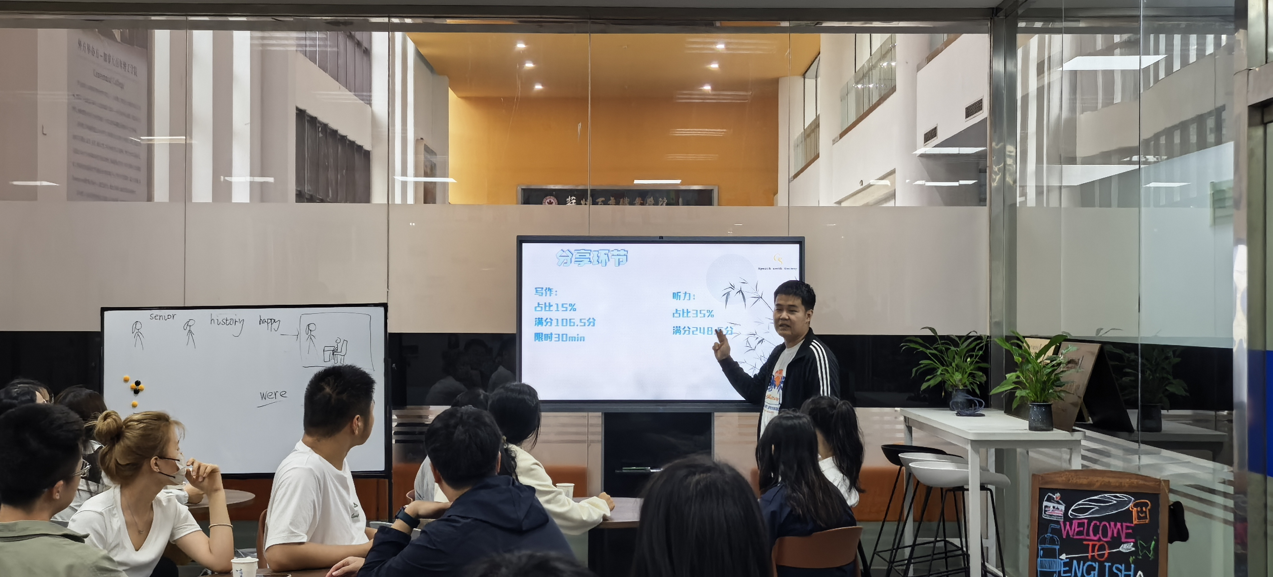 刑同学以听力和写作技巧为例,融合中外语言学习逻辑,全方位为同学们揭示了这两大难关中隐藏的逻辑密码。叶同学围绕词汇、阅读、翻译等板块展开分享,通过剖析单词构词逻辑提升记忆效率,并强调“精读+刷题”结合的阅读训练模式,帮助学生进一步提升答题准确率和速度。