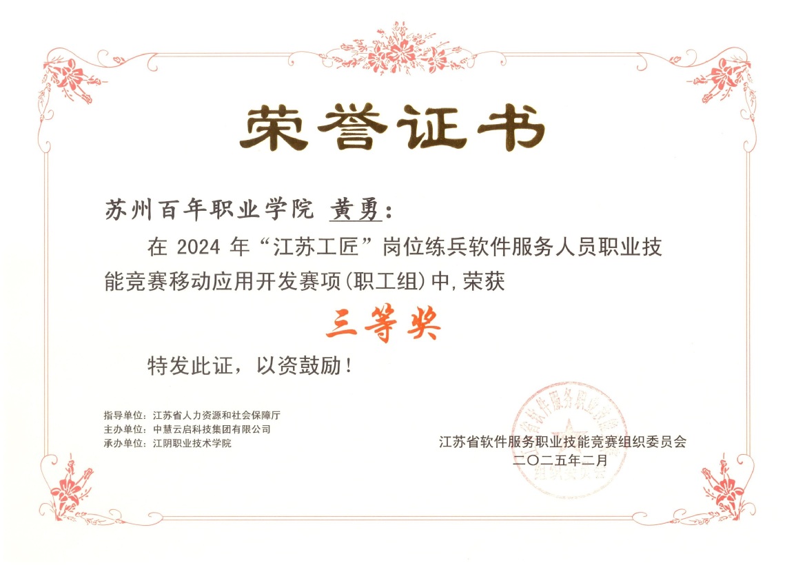 近日,从 2024 年 “江苏工匠” 岗位练兵软件服务人员职业技能竞赛传来喜讯,开云工学院教师黄勇在移动应用开发赛项(职工组)中表现优异,荣获三等奖。这一成绩不仅彰显了黄勇老师的个人专业实力,也为学校及工学院增添了光彩。
