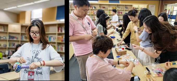 艾草锤制作区药香弥漫。教师们将晒干艾叶填入棉布,缠绕麻绳制成养生锤。“一锤祛湿寒,二锤筋骨舒!”老师们打趣着互试手艺,清冽药香随欢声流淌。五彩绳编织区,专人指导金刚结、平安扣等传统编法,“青赤黄白黑”五色丝线不仅缠绕出吉祥寓意,更串联起代代相传的工匠精神。