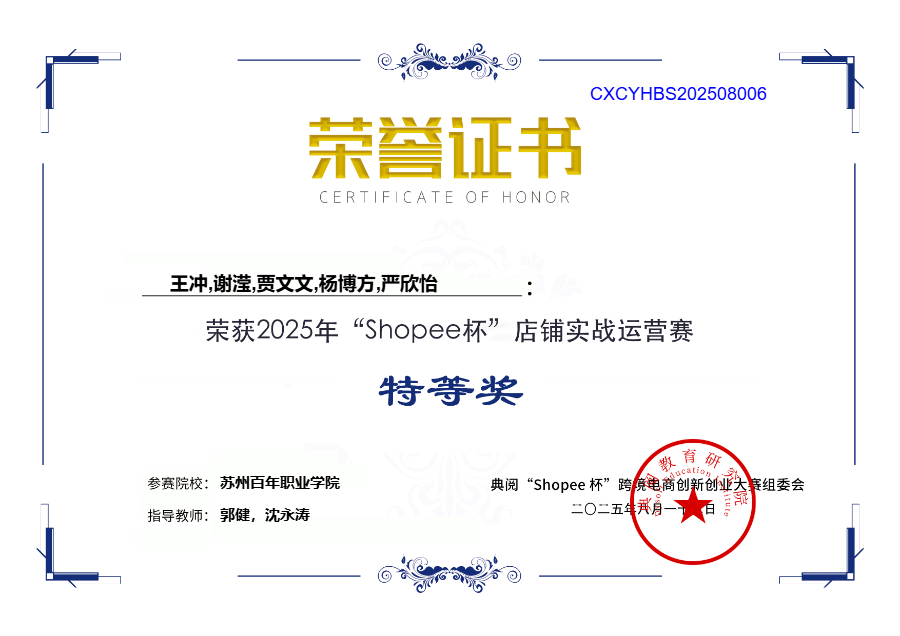本届大赛首次将“真实店铺运营”纳入竞赛评分体系,吸引了全国174所院校、522支队伍同台竞技。自3月起启动备赛以来,学院组建“跨境电商创新工坊”,五位指导教师带领15名同学,历时5个月多轮实战演练与全真店铺孵化,最终,“苏州百年职业二队”(杨博方、谢滢、贾文文、严欣怡、王冲,指导教师:郭健、沈永涛)在三个月内把一家零信誉新店打造为全国综合评分第六的标杆店铺,实现从“学生店铺”向“标杆店铺”的跨越。