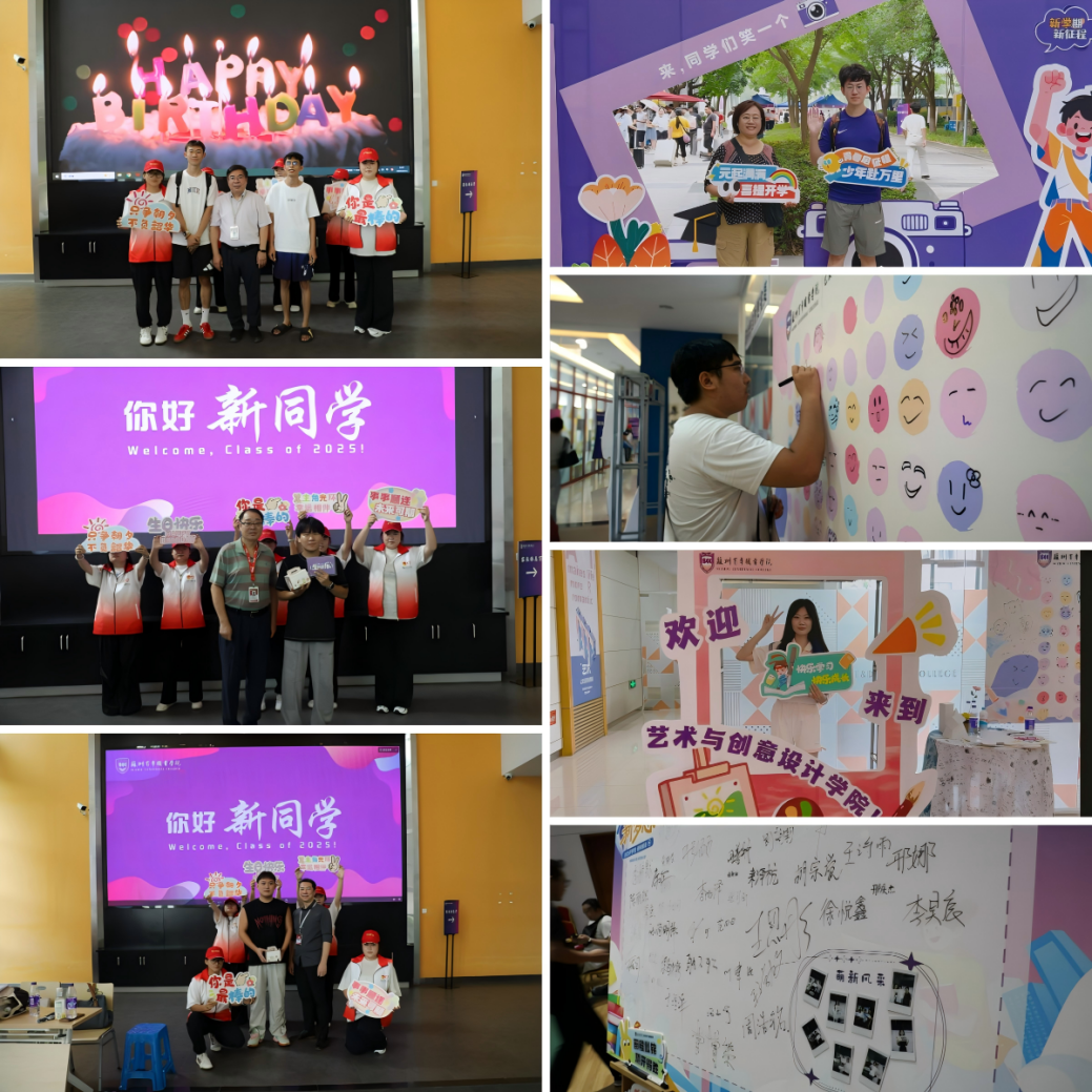 为了给2025级新生留下独特的入学记忆,各工作组与二级学院精心策划了一系列暖心活动。针对家庭经济困难新生,学校送上包含生活用品、学习资料的“五馨”助学礼包,以实际行动解决他们的燃眉之急;为报到当天过生日的新生精心准备生日蛋糕与合唱生日歌,让他们在异乡收获别样的惊喜与感动;各学院打造的创意打卡区各具特色,新生们或在‘青春笑脸墙’上画上属于自己的笑脸,或在签名板上留下姓名和美好愿望,或与照片墙合影留念……这些充满心意的设计,不仅让新生感受到校园的热情与活力,更让他们对未来的大学生活充满向往。