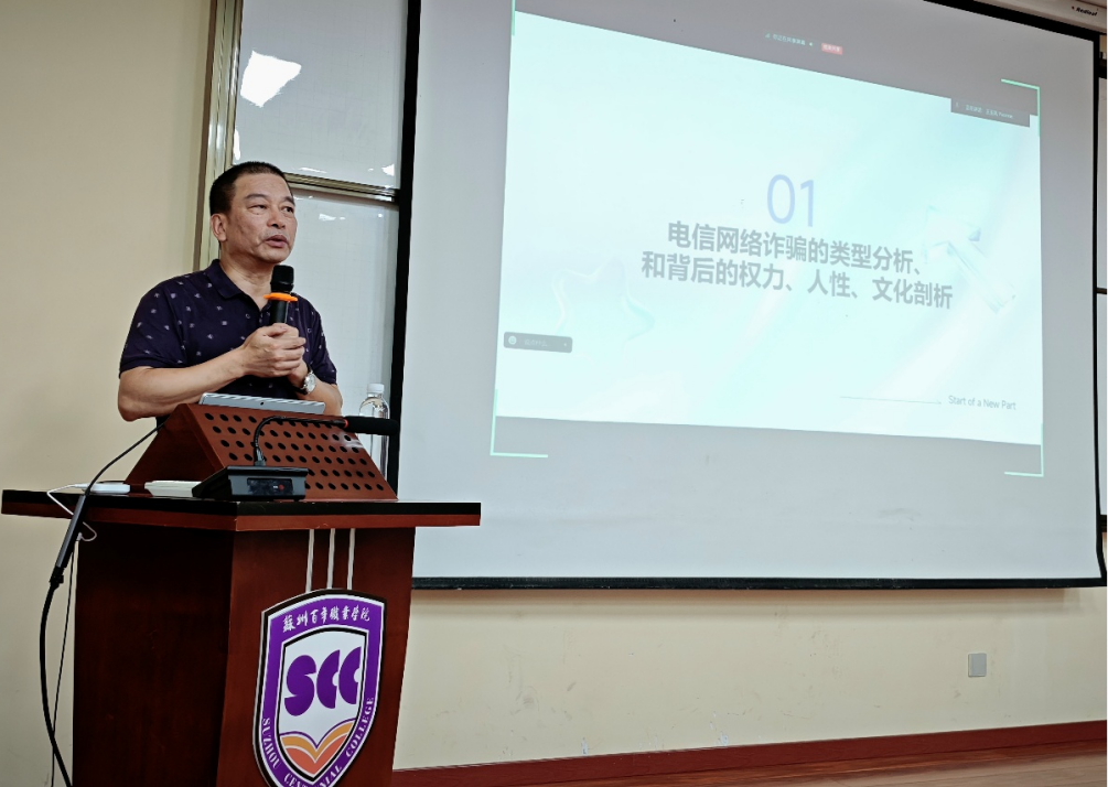 薛建明从“何为法治”切入,强调法治的核心是保障公民自由、限制政府权力,实现社会公平与透明治理。他结合大学生常见风险,重点剖析了电信网络诈骗的类型与成因,指出“权力崇拜”和“贪快钱”心理是受骗的重要根源,提醒同学们保持独立思考,增强信息辨别能力。