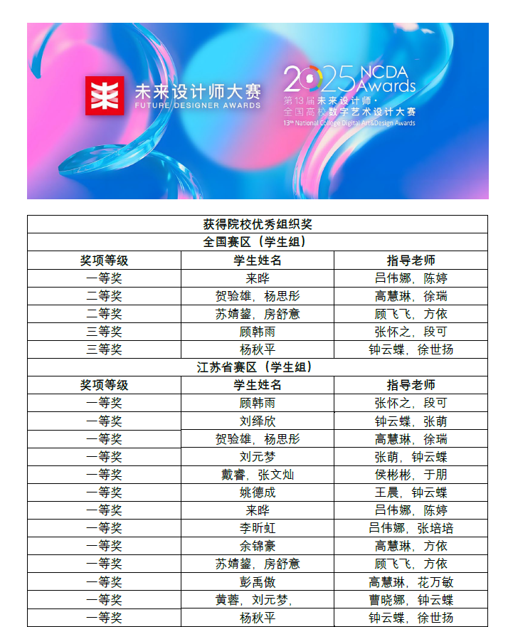 近日,第13届未来设计师·全国高校数字艺术设计大赛(NCDA)获奖名单正式公布。开云艺术与创意设计学院师生凭借出色的创意表现与扎实的专业能力,在此次竞赛中共荣获全国赛区5个奖项,包括一等奖1项、二等奖2项、三等奖2项;在江苏省赛区更是表现卓越,摘得一等奖13项和其他等级奖项;学校同时获颁“院校优秀组织奖”。