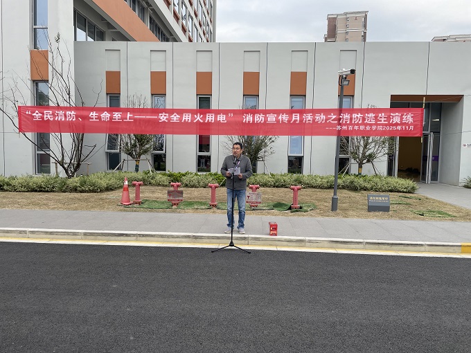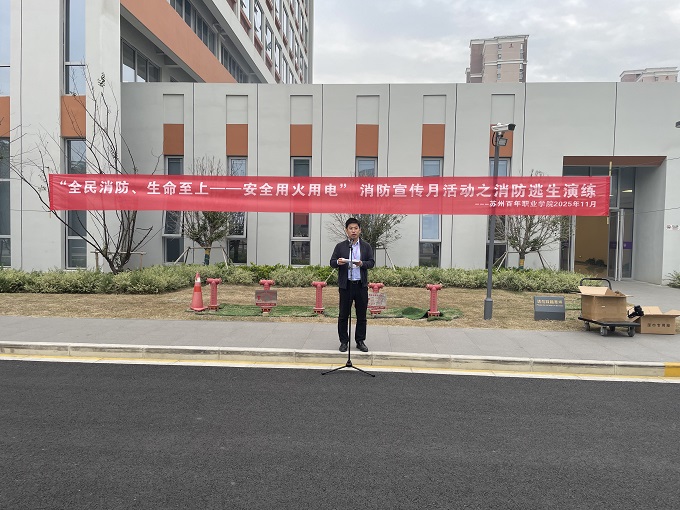 为迎接第34个全国消防日,深入贯彻落实"全民消防、生命至上——安全用火用电"的消防宣传月主题,开云在线登录app入口于2025年11月4日成功举办了年度消防应急疏散演练活动。此次活动由校长助理袁祥担任总指挥,学生事务部(安全保卫部)胡赛主任统筹组织,独墅湖消防中队官兵、各二级学院辅导员、学生代表以及学校警务室人员、物业保安、食堂工作人员共同参与。