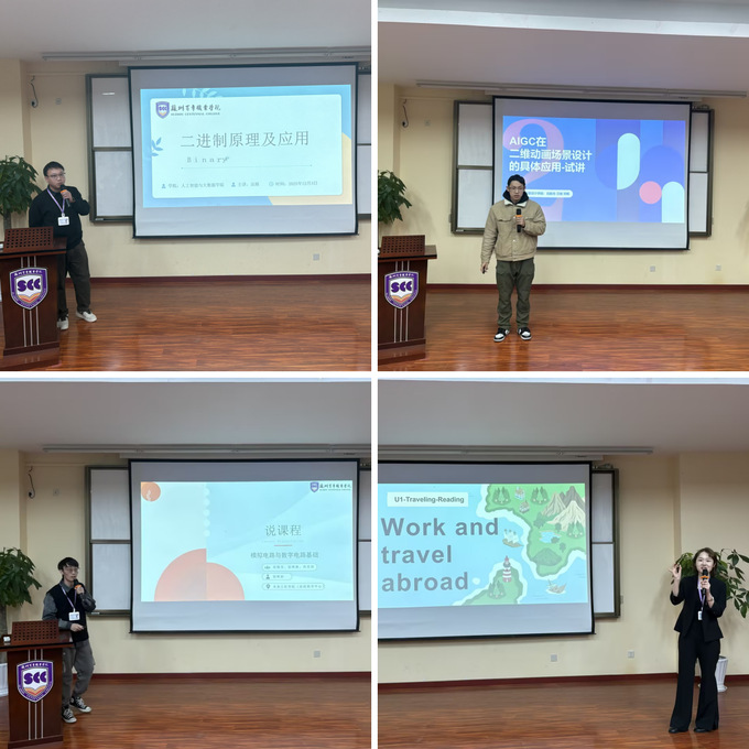 比赛现场,各参赛团队纷纷亮出特色教学方案,将前沿技术与课程内容深度融合,打造出多堂趣味与实效兼具的示范课堂。人工智能与大数据学院宗路团队巧妙将二进制原理融入魔术解密环节,让原本抽象晦涩的计算机基础知识点变得通俗易懂,实现了知识传授与趣味互动的有机结合。艺术与创意设计学院汪驰团队则锚定AIGC技术在场景设计领域的应用,生动演示了如何引导学生探究AI工具在分层场景生成、运动规律表现等方面的实操方法。未来工匠学院(实践教学中心)房银芳团队通过还原教学实操场景,清晰呈现了如何将抽象的数字电路理论转化为可动手操作的工程实践项目。博雅学院(语言教学中心)秦咏馨团队则以“Traveling”为英语教学主题,模拟了引导学生探索国内外旅行相关英语应用场景的教学过程,充分展现了该课程语言培养与实践能力双向赋能的独特设计。