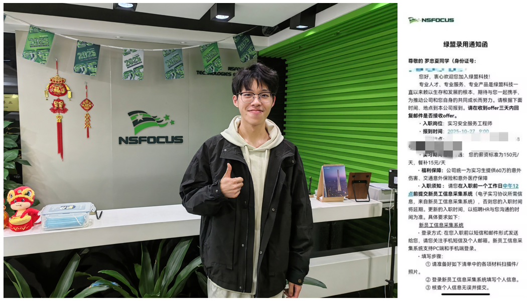 “这份荣誉是对我大学期间持续学习和实践的一次检验,也感谢学院提供的平台和企业导师的指导。”罗忠夏表示,未来将继续深耕网络安全领域,努力提升技术能力,为守护网络空间安全贡献自己的力量。
