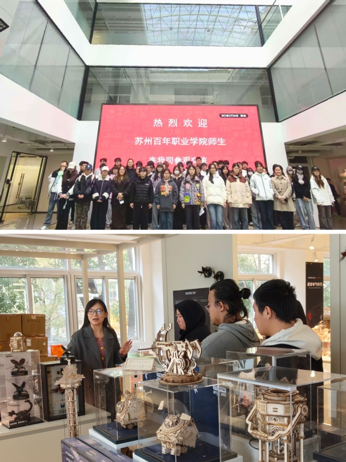 活动中,师生们首先走访了企业的办公区域,近距离感受文创科技公司一线的工作氛围。随后,师生参观了若态大厦的企业展厅。相关负责人系统介绍了旗下若来(Rolife)、若客(Rokr)等品牌的产品矩阵,包括备受瞩目的国风盲盒IP“Nanci”的设计理念,以及企业与百事可乐等知名品牌的联动产品案例。讲解中特别提及了产品如何针对不同国家市场与不同年龄层用户进行设计与市场定位,体现出企业在全球化布局中的精细运营思维。