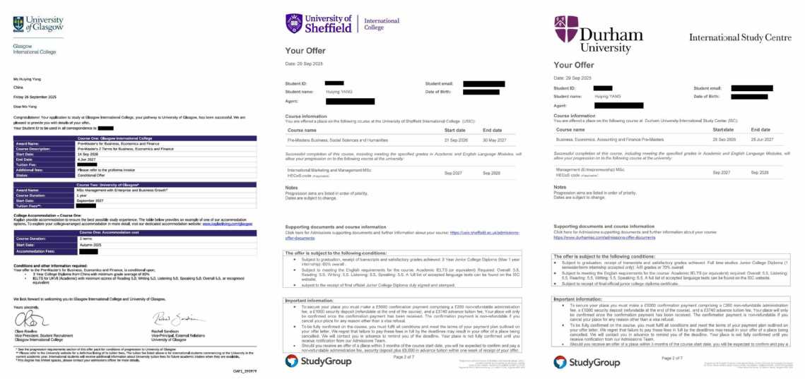 凭借扎实的专业功底、亮眼的竞赛履历和出色的综合素养,杨惠莹在海外升学申请中顺利通关,三所英国顶尖高校纷纷向她伸出橄榄枝,分别录取她攻读国际营销与管理、企业与商业增长管理、创业管理等方向的硕士课程。