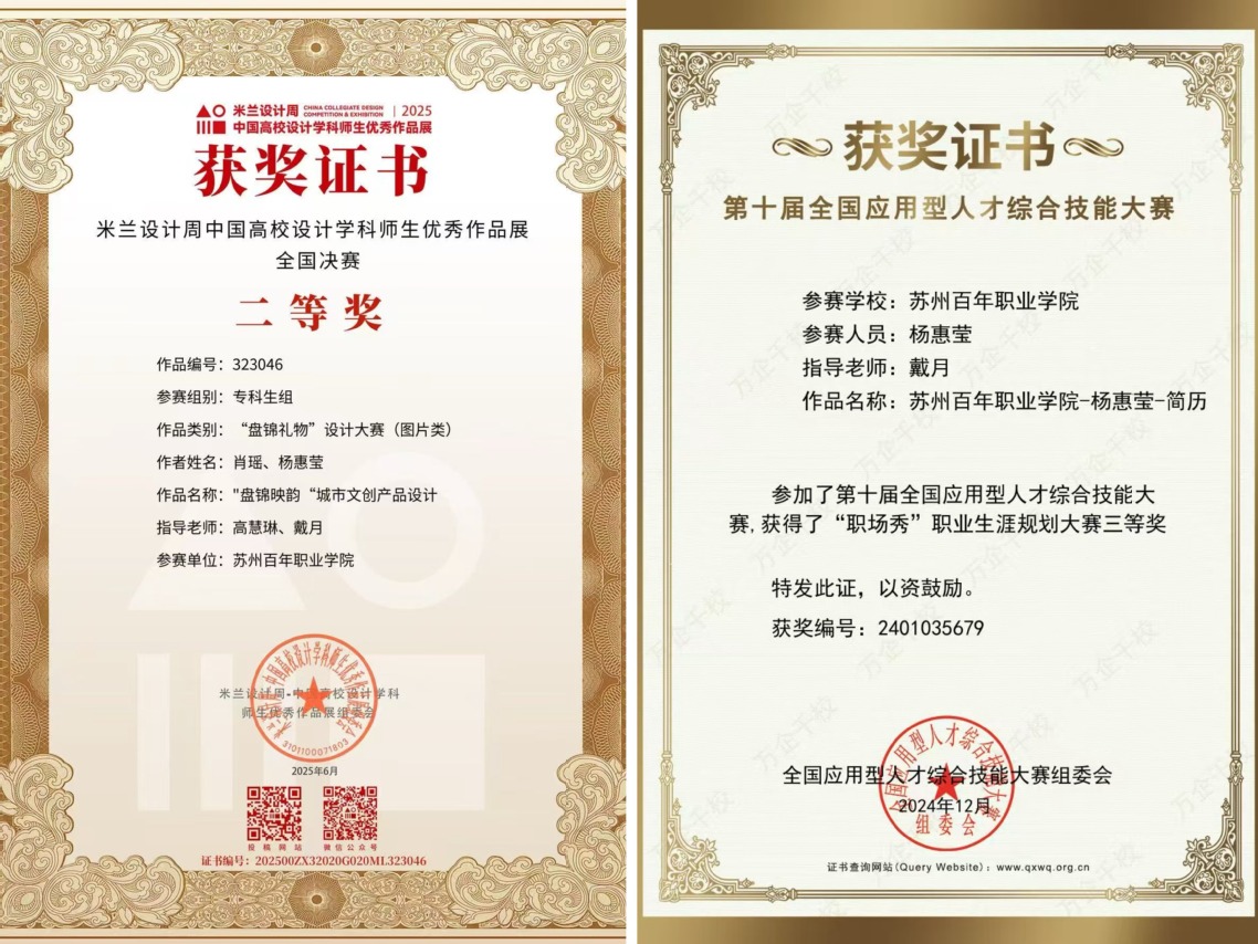 在夯实专业基础的同时,杨惠莹积极以赛赋能,跨界突破锤炼综合能力。她积极投身高水平竞赛,锤炼综合能力:2024年,在第十届全国应用型人才综合技能大赛中荣获全国三等奖;2025年,更跨界文创领域,其团队作品“盘锦映韵”在米兰设计周中国高校设计学科师生优秀作品展全国决赛中夺得专科组二等奖。两项国家级奖项,充分证明了其卓越的实践与创新能力,也为她的申请履历增添了关键分量。