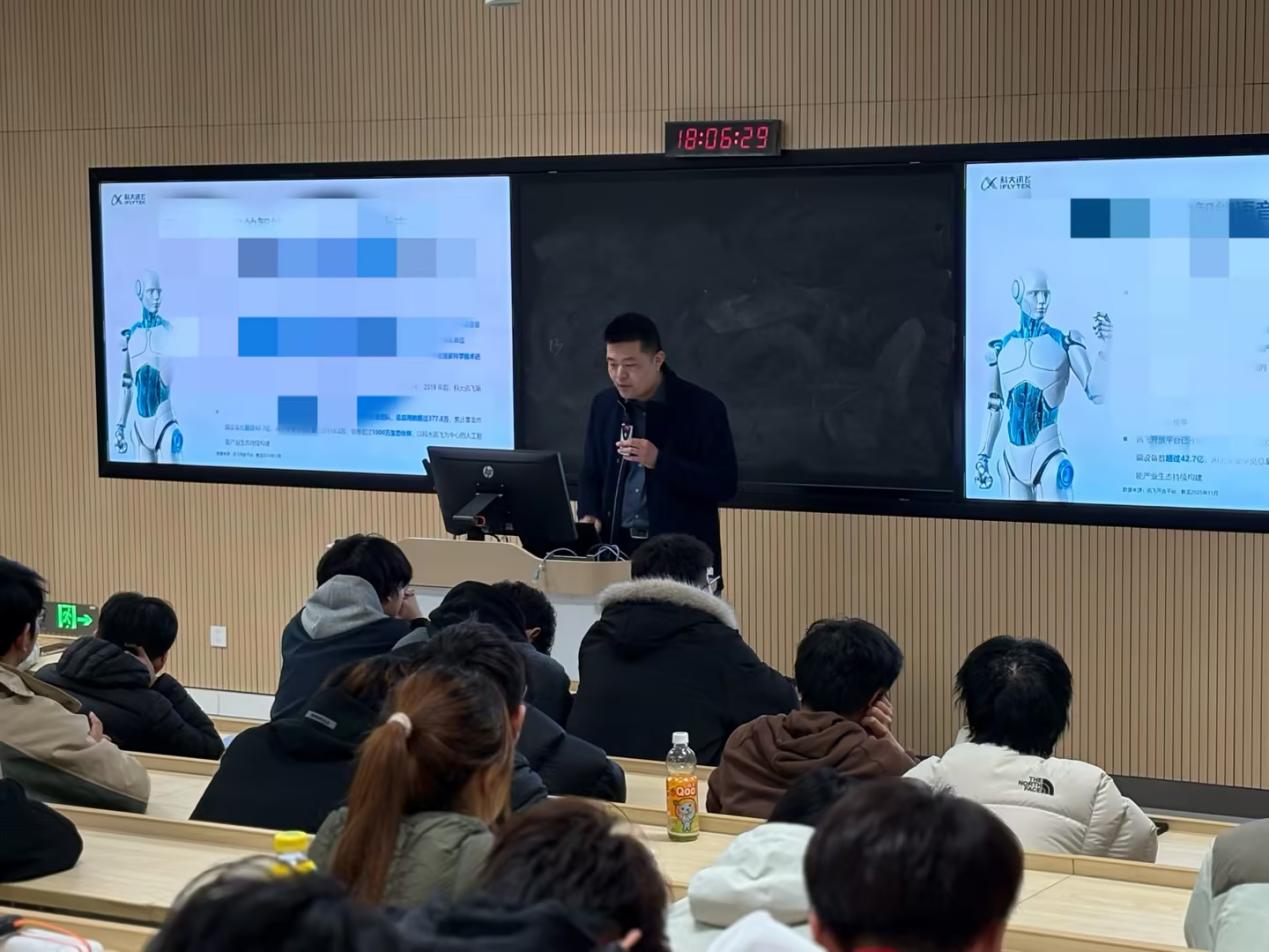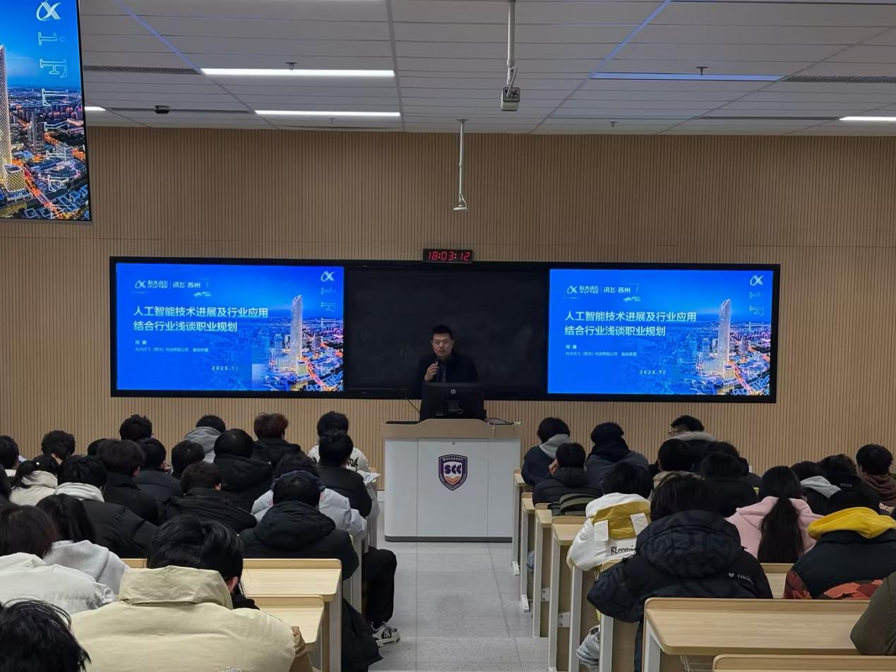 2025年12月16日晚,科大讯飞(苏州)科技有限公司副总经理何鑫应邀来到开云在线登录app入口,为人工智能与大数据学院2025级学生作“人工智能技术进展及行业应用——结合行业浅谈职业规划”主题讲座。相关专业班级学生到场聆听。