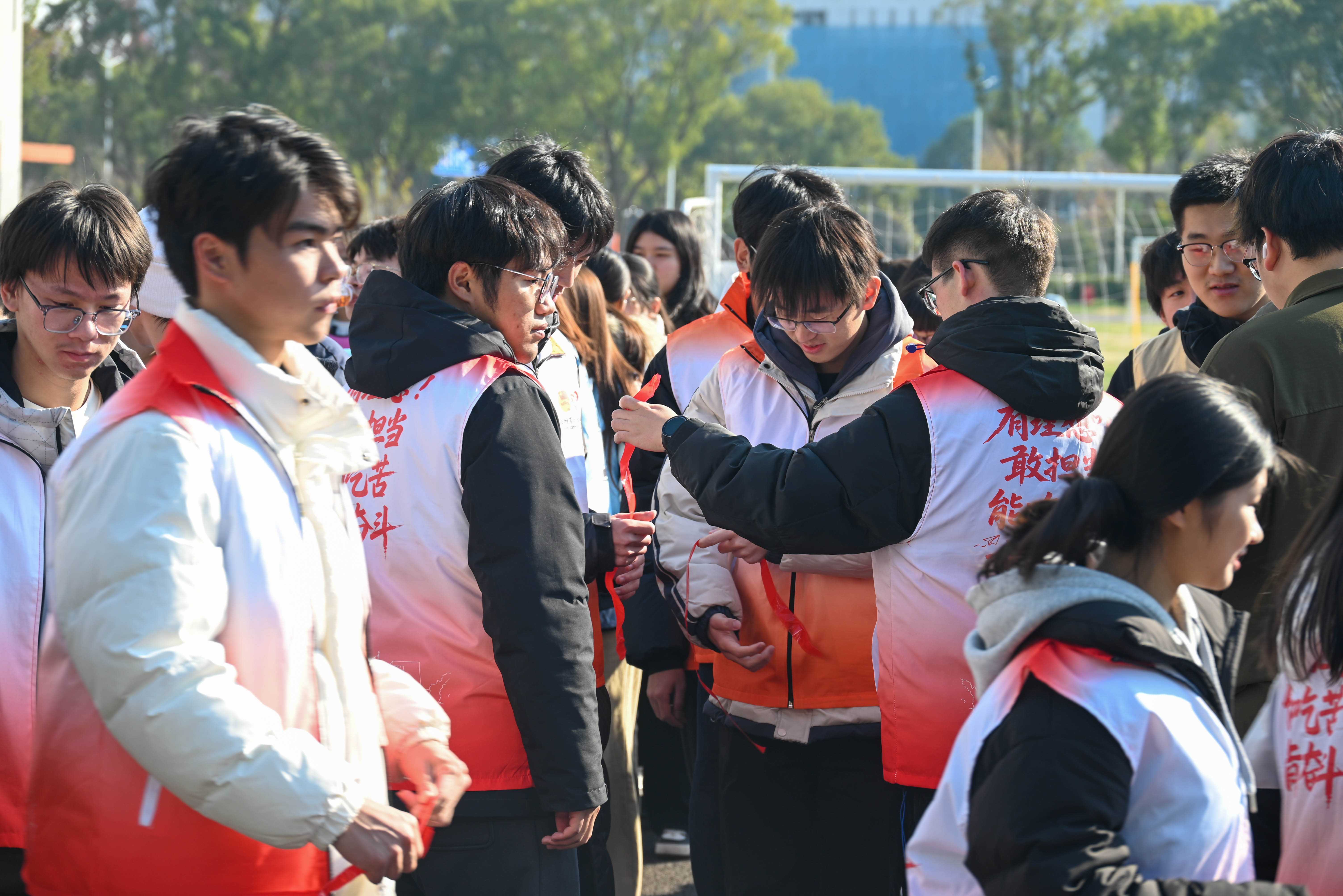 活动开场通过破冰分组与团队组建迅速升温。同学们围圈报数、随机组队,统一着装并完成队伍标识,在短时间内完成从“陌生”到“同伴”的转换;各队同步确定队名口号、推选队长、明确分工策略,现场口号声与加油声此起彼伏,展现出学生骨干昂扬向上、敢拼敢闯的青春风貌。工作人员统一进行规则讲解与安全提醒,现场实行项目点位责任制与成绩复核机制,确保流程规范有序、组织运行高效、赛事公平公正。