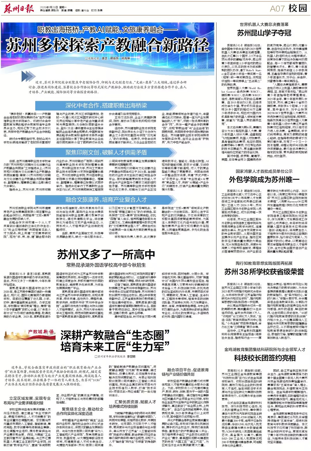 近年来,学校全面落实市政府提出的“职业教育面向产业办学”的决策部署,积极探索并实践产教融合新路径、新模式,锚定需求精准育才,推动职业教育与地方产业发展同频共振,构筑起集人才培养、技术创新、社会服务于一体的育人新生态,为苏州“1030”产业体系及地方经济社会高质量发展注入强劲动能。