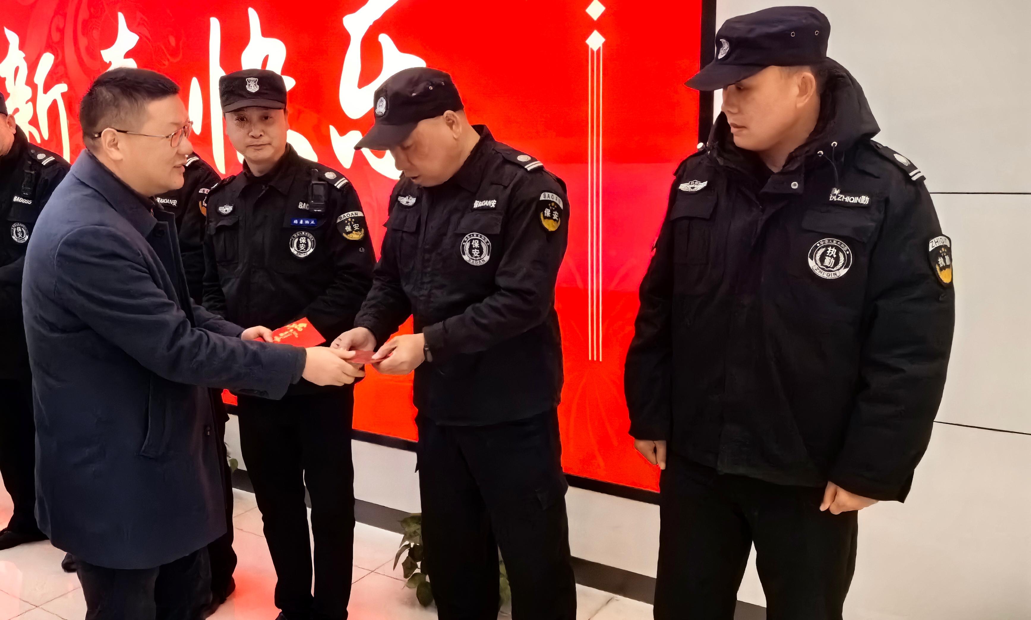 校领导们先后前往物业办公室、校园监控中心、消防控制中心及各门卫值守岗亭。每到一处,都与在岗人员亲切交流,详细询问并深入了解春节期间校园安全保卫工作部署、后勤服务保障具体安排等情况。校领导们亲手将精心准备的新年礼包递到每位坚守者手中,传递着学校的深切关怀。