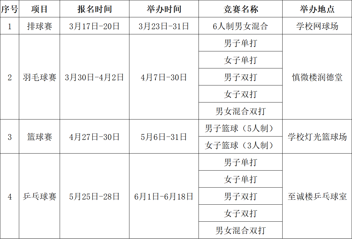 承办单位:篮球社、排球社、乒乓球社、羽毛球社
