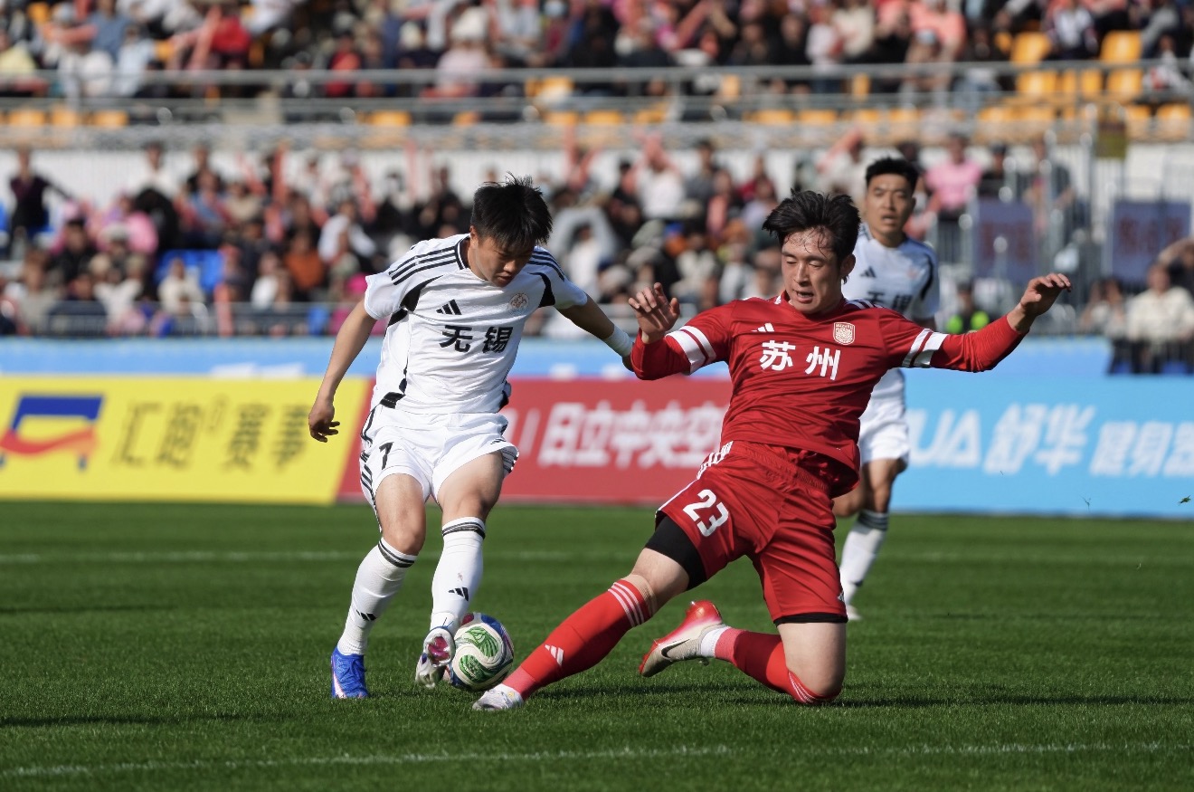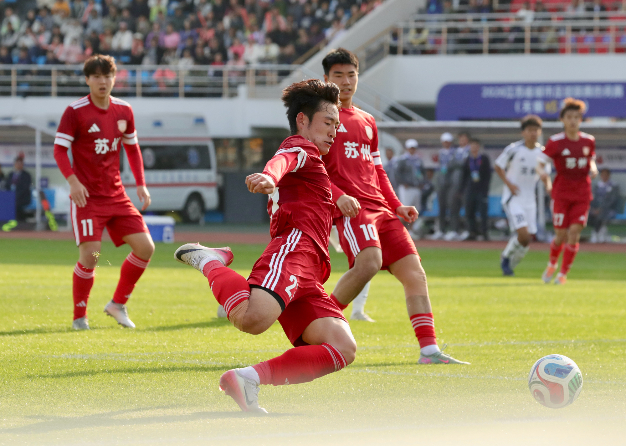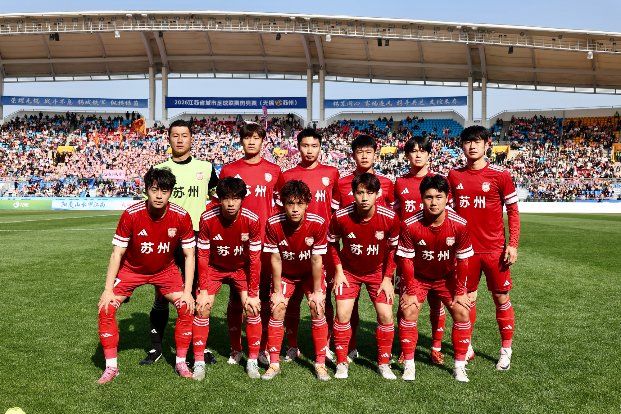 3月28日,2026年江苏省城市足球联赛热身赛在宜兴市体育中心体育场激情开赛,苏州队客场对阵无锡队。开云足球队队长、数字经济与管理学院2023级学生麻轩瑞身披23号球衣代表苏州队首发出战。热身赛现场共有20059名球迷观战,比赛氛围热烈,看台上不时响起阵阵助威呐喊声,旌旗招展,鼓点激昂。