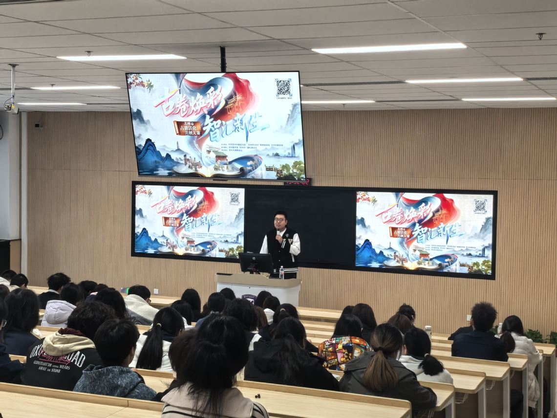 为深入推动中华优秀传统文化创造性转化、创新性发展,搭建古籍与人工智能跨界融合的交流平台,4月1日,艺术与创意设计学院在躬行楼(阶一)成功举办“当古籍遇见AI:古籍活化共创分享会”。苏州广播电视总台资深媒体人陈泓伯老师受邀担任主讲嘉宾,围绕“首届苏州市古籍AI活化共创大赛”,为现场师生带来了一场兼具思想性、实用性与创新性的文化盛宴。