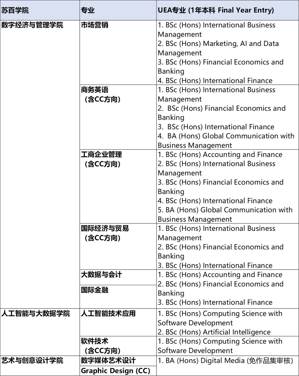 根据协议,双方将充分发挥各自优势,重点围绕商科、计算机与人工智能、艺术与创意设计等核心领域展开深度合作。此次合作的核心亮点在于,为符合条件的SCC毕业生搭建了一条“一年获取英国本科学位”的国际升学“快车道”。在SCC顺利完成国内专科阶段学业并达到规定要求的学生,可选择前往UEA进行为期一年的学习深造,学业合格后将获得UEA颁发的本科学位证书。